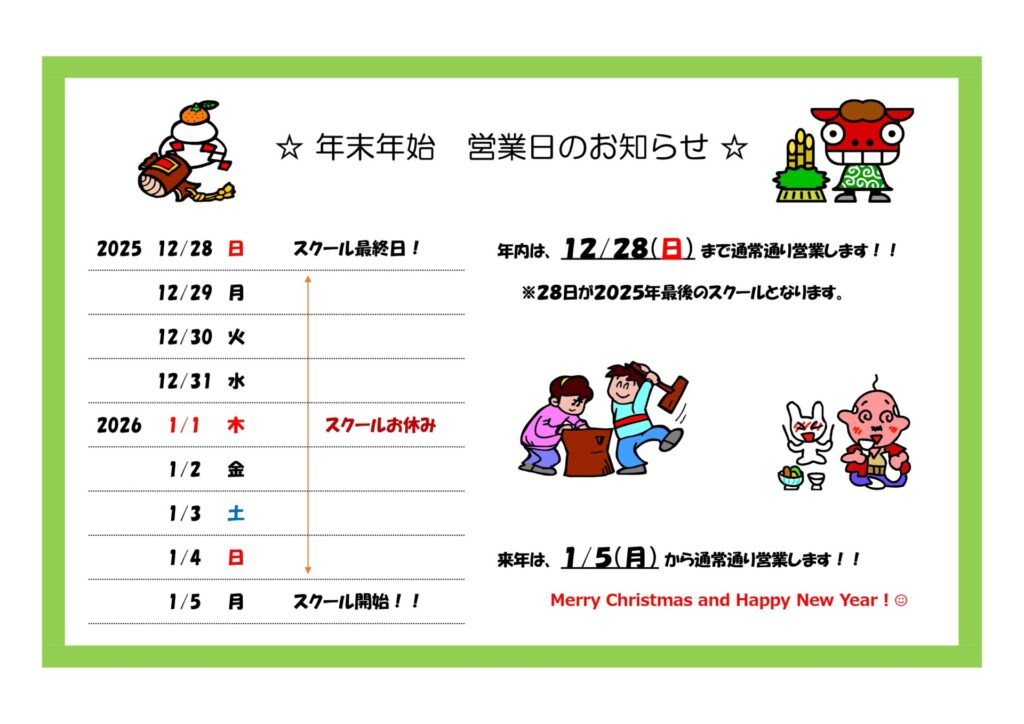 【12/29(月)~1/4(日)】の1週間、スクールがお休みになります。